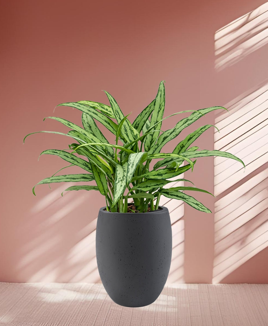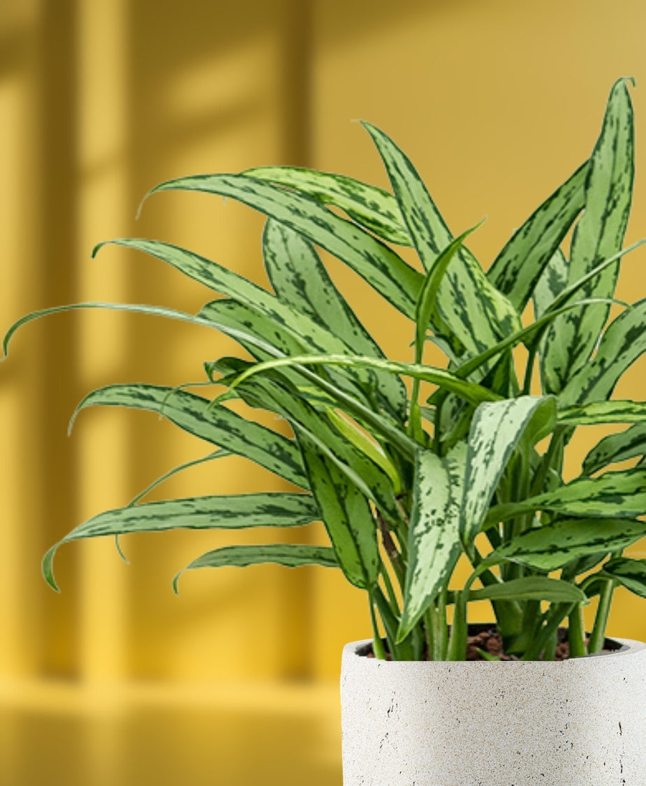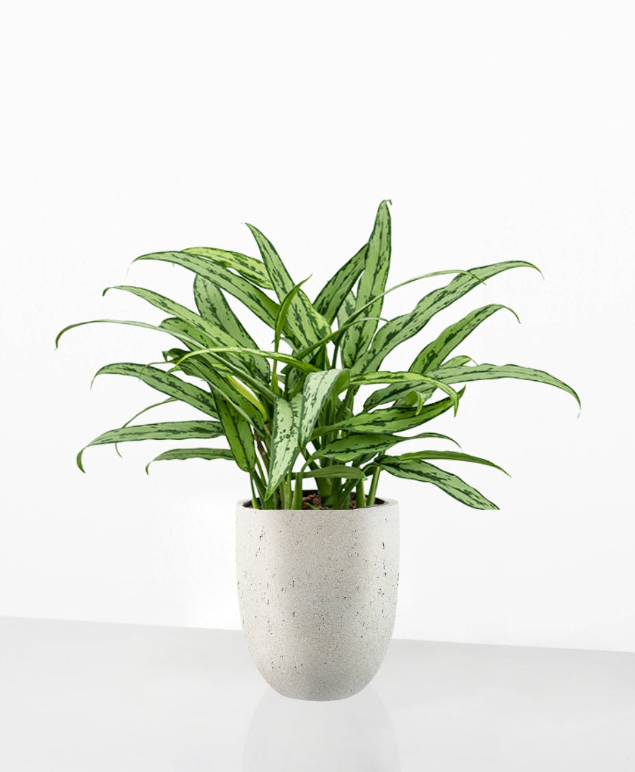Die Aglaonema 'Cutlass', auch bekannt als Kolbenfaden, ist eine pflegeleichte, schattenverträgliche Zimmerpflanze, die ursprünglich aus den tropischen Wäldern Südostasiens stammt. Ihre schmalen, elegant gezeichneten Blätter in silbrig-grünen Tönen verleihen ihr ein modernes, stilvolles Erscheinungsbild, das sich harmonisch in jede Wohn- oder Büroumgebung einfügt. Sie eignet sich ideal für halbschattige Standorte und bringt mit ihrem dezenten, exotischen Charakter eine ruhige, edle Note in jeden Raum.